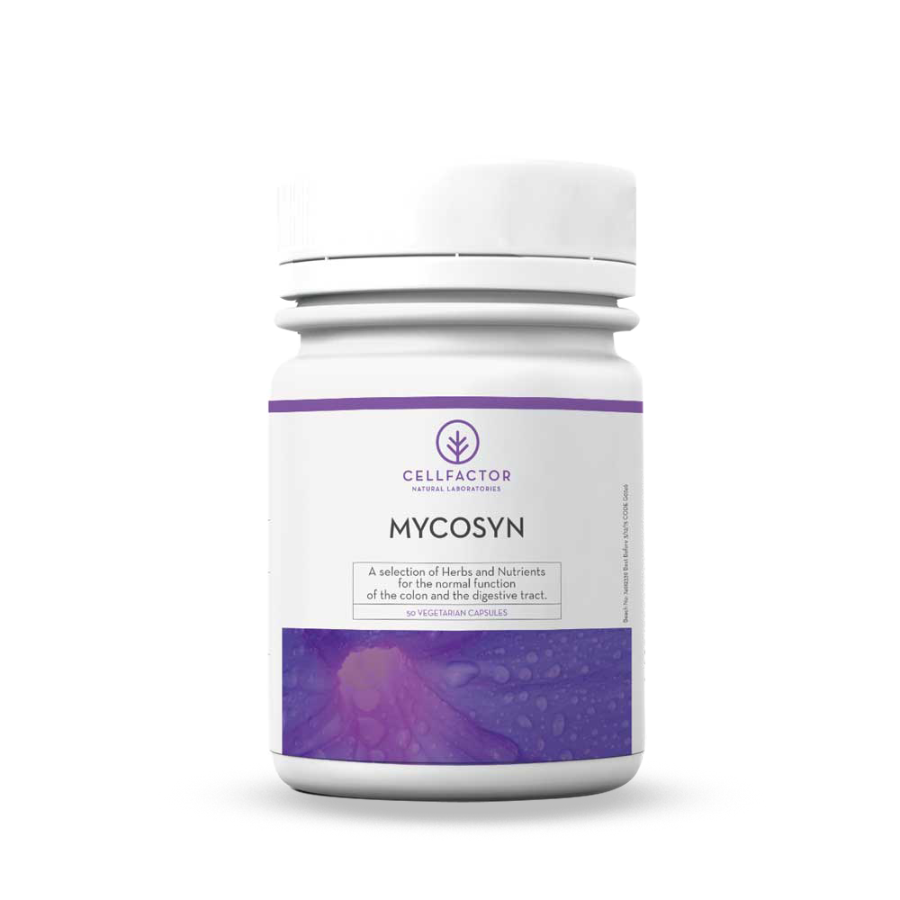 Το MYCOSYN είναι ένα συμπλήρωμα διατροφής που περιέχει Ψύλλιο, βιταμίνη C, Γαρύφαλλο, στίγματα Αραβοσίτου, Τζίντζερ, Φύκη Ascophyllum nodosum, Πεντάνευρο, Ραβέντι, Ματέ, Λακτοβάκιλλους, Βιοφλαβονοειδή εσπεριδοειδών και εκχύλισμα Αλόης.