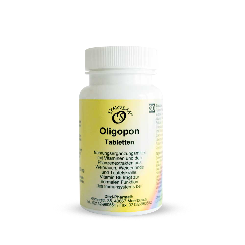 Το Oligopon είναι ένα συμπλήρωμα διατροφής που περιέχει φυτικά εκχυλίσματα των καταπραϋντικών φυτών Μποσβέλιας, Ιτιάς, Αρπαγόφυτου. Επίσης περιέχει τις βιταμίνες Β1, Β2 και Β6.