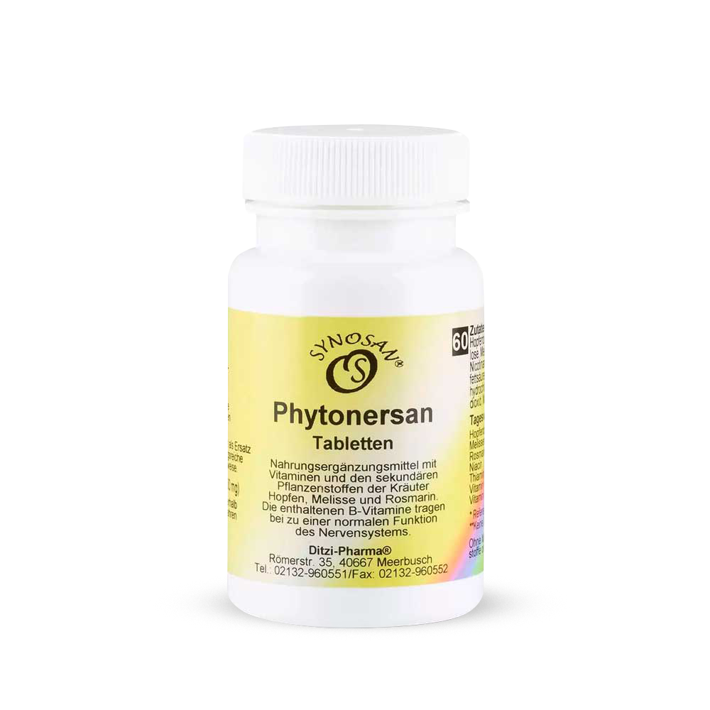 Το Phytonersan είναι ένα συμπλήρωμα διατροφής που περιέχει βιταμίνες Β6, Β12, Θειαμίνη, Νιασίνη και σκόνη από Λυκίσκο, Μελισσόχορτο και Δενδρολίβανο.
