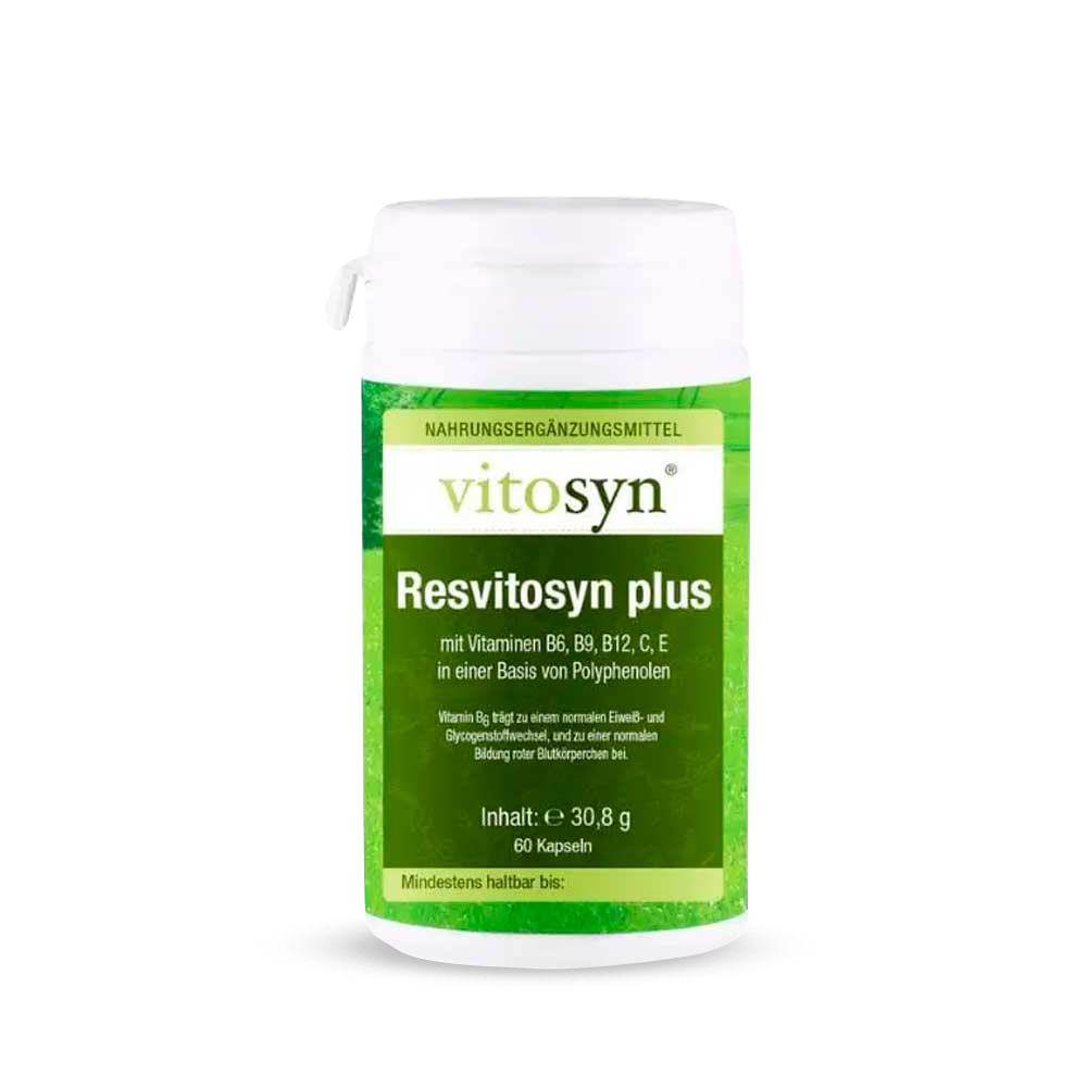 Το Resvitosyn plus είναι ένα συμπλήρωμα διατροφής που περιέχει Κουρκουμίνη, Ρεσβερατρόλη απó εκχύλισμα ριζών Polygonum Μultiflorum, Κουερσετίνη,  βιταμίνες C, E, B6, B12 και Φολικό οξύ.